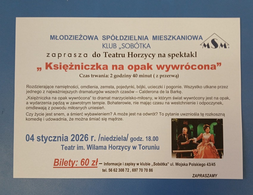 Bilety: 60 zł – Informacje i zapisy w klubie ,,Sobótka” ul. Wojska Polskiego 43/45